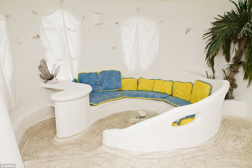 Nhà nghỉ hình vỏ sò ở Isla Mujeres, Mexico với giá 179 bảng/đêm. Bên trong hình vỏ sò cao hơn là khu ghế ngồi, nhà bếp được trang bị đầy đủ tủ lạnh, lò vi sóng, bếp gas và bồn rửa.
