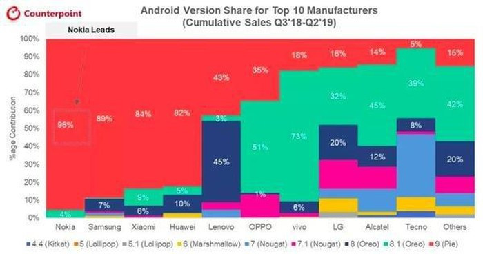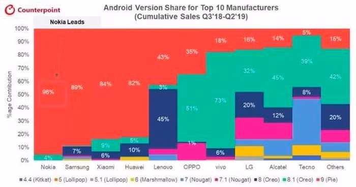 Cụ thể, Counterpoint Research cho biết 96% điện thoại Nokia bán ra kể từ thời điểm Google tung ra Android Pie được đã cài sẵn phiên bản mới nhất của hệ điều hành này hoặc đã nhận được các bản cập nhật mới. Samsung, Xiaomi và Huawei chiếm tỷ lệ khoảng 80%, khoảng cách khá xa so với những gì Nokia làm được. Lenovo và OPPO có con số dưới 50% còn LG, vivo và một số hãng khác có kết quả dưới 20%.