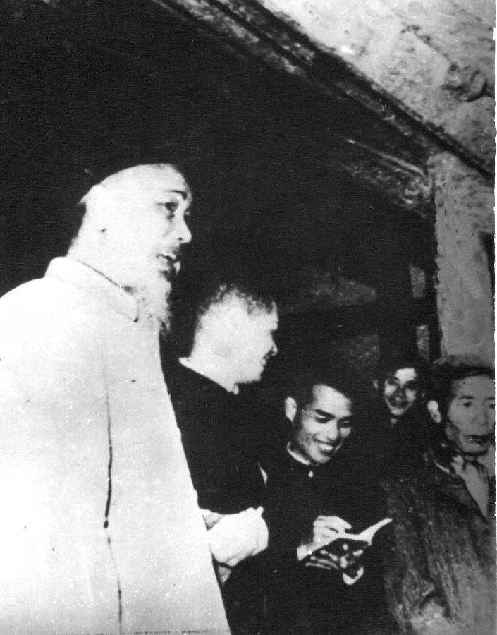 Trên bức tường cũ kỹ vẫn những bức ảnh ghi dấu ấn lịch sử cuộc đời ông. Trên đó là bức ảnh anh nhà báo trẻ Sơn Tùng đứng cạnh Bác Hồ đang ghi ghi chép chép. Đấy là sân đình làng Lỗ Khê, Đông Anh sáng mồng Một Tết.