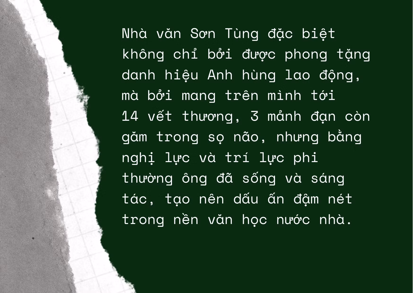 Cô gái ấy đã tự nguyện đến với ông và Sơn Tùng có lại một cuộc đời... Bà là người chăm sóc ông, là người nối dài cánh tay của nhà văn Sơn Tùng để đánh máy hàng vạn trang viết của nhiều cuốn tiểu thuyết. Và cho tới hôm nay, khi ông nằm đó bất động, bà vẫn bên cạnh ông, vẫn vì ông mà nồng nàn hơi thở: