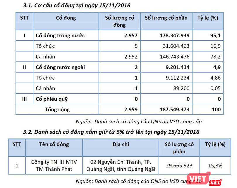 Khi chào sàn UPCoM vào cuối năm 2016, cơ cấu sở hữu của QNS vẫn rất phân mảnh, với 2.959 cổ đông, trong đó 2.952 cổ đông cá nhân (phần lớn là người lao động công ty) nắm giữ tới 78,2% vốn cổ phần. Nhóm cầm quyền ở QNS nhiều năm qua, là ban lãnh đạo công ty, theo tính toán của VietTimes hiện cũng chỉ nắm giữ khoảng 17,5% cổ phần – bao gồm cả sở hữu của người có liên quan.