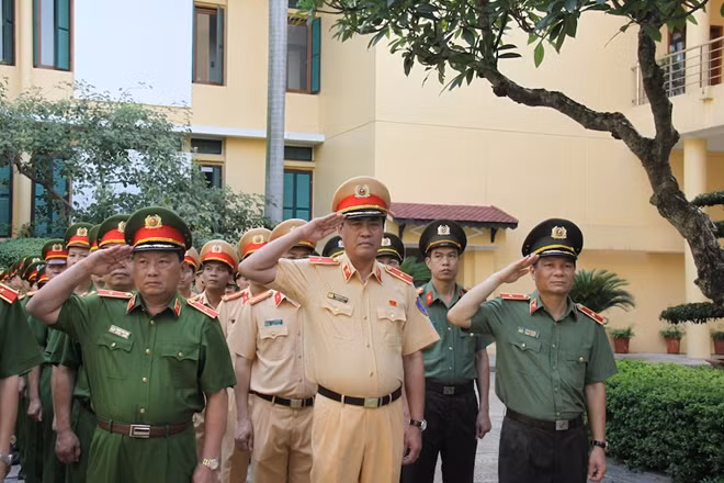 Thứ trưởng Nguyễn Văn Thành và cán bộ chiến sĩ trụ sở cơ quan Bộ Công an thực hiện nghi lễ chào cờ đầu tháng 6 trong trang phục mới