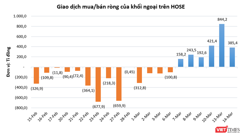 Khối ngoại tiếp tục mua ròng trên sàn HOSE, song giá trị đã giảm bớt với 385,4 tỉ đồng. Họ tập trung mua VHM (+69,3 tỉ đồng), SSI (+61 tỉ đồng), HSG (+60,7 tỉ đồng), POW (+58,1 tỉ đồng).
