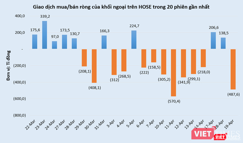 Khối ngoại cũng đảo chiều bán ròng trên sàn HOSE trong phiên hôm nay, với giá trị bán ròng đạt 487,6 tỉ đồng.