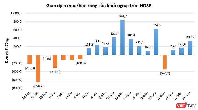 Các nhà đầu tư nước ngoài tiếp tục mua ròng 339,2 tỉ đồng trên HOSE, tập trung vào các mã cổ phiếu vốn hóa lớn như VHM (89,6 tỉ đồng), HPG (80,1 tỉ đồng), VNM (68 tỉ đồng).