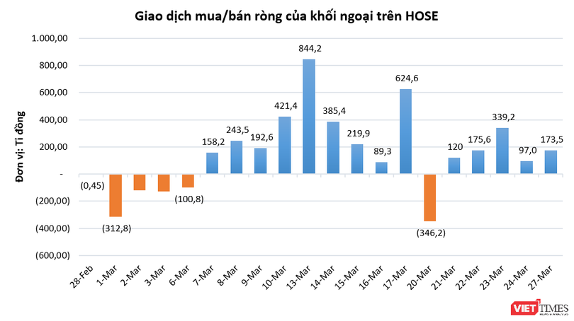 Thanh khoản trên toàn thị trường đạt 10.863 tỉ đồng, tăng 9,6% so với mức bình quân của tuần trước. Nhà đầu tư nước ngoài duy trì mua ròng trên HOSE với giá trị 173,5 tỉ đồng, mua ròng ở HNX với giá trị 0,99 tỉ đồng.