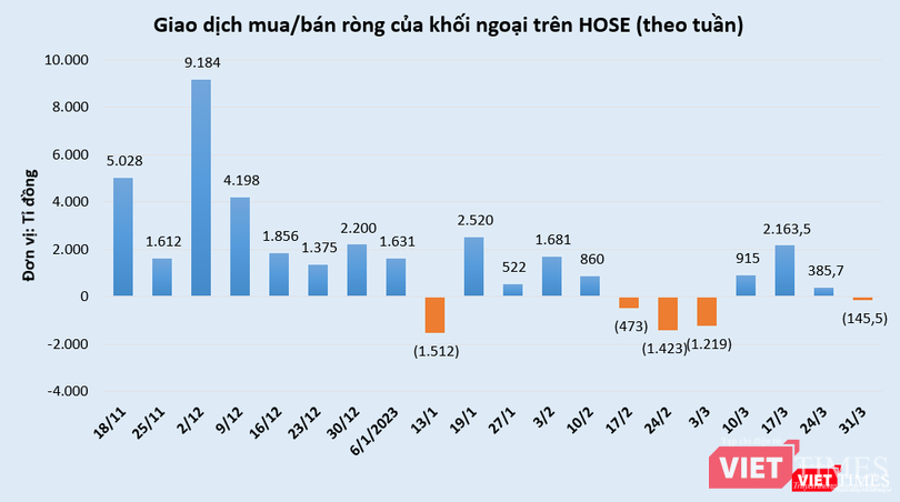 Khối ngoại chuyển bán ròng 145,5 tỉ đồng trên HOSE trong tuần 27-31/3. Tuy nhiên, lũy kế tháng 3/2023, khối ngoại vẫn mua ròng tới 2.759 tỉ đồng, trong khi nhà đầu tư cá nhân bán ròng 948 tỉ đồng.