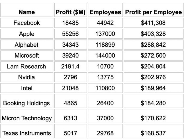 Đúng như dự đoán, những công ty có lợi nhuận cao nhất như Facebook và Apple cũng có chỉ số PPE cao nhất. Chẳng hạn, PPE của Facebook là 411.308 USD, còn PPE của Apple là 403.328 USD. Trong khi đó, PPE của Alphabet, công ty mẹ Google, là 288.842, Microsoft là 272.500 USD.