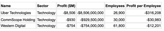 Tuy nhiên, không phải công ty nào cũng gặt hái lợi nhuận. Nghiên cứu còn tiết lộ top 3 công ty mất tiền nhiều nhất trên mỗi nhân viên. Không ngạc nhiên khi Uber, hãng gọi xe mãi chưa sinh lời, lại đứng đầu danh sách với PPE là “âm” 316.208 USD.