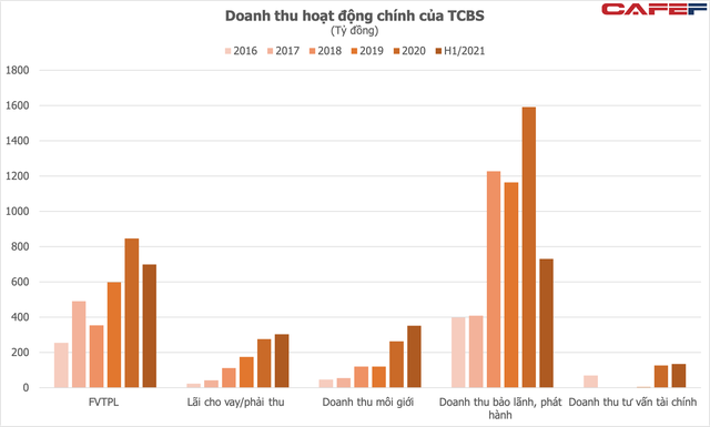 Các nguồn thu lớn khác của TCBS gồm: doanh thu nghiệp vụ bảo lãnh, bảo lãnh - đại lý phát hành chứng khoán 731 tỷ đồng, doanh thu nghiệp vụ môi giới chứng khoán 351 tỷ đồng, lãi từ cho vay và phải thu 303 tỷ đồng và doanh thu từ nghiệp vụ tư vấn tài chính 135 tỷ đồng.