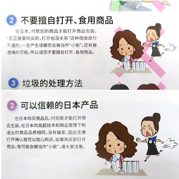 Quyển hướng dẫn "Du lịch tại Hokkaido" này được xuất bản hồi tháng 3, in nhiều hình ảnh minh họa có đánh dấu "X" nói về các hành vi không chuẩn mực. Ngoài tiếng Trung, hướng dẫn cũng được viết bằng tiếng Anh có phần nhẹ hơn, ví dụ như "Tại Nhật Bản, bạn có thể mua sản phẩm đảm bảo về chất lượng mà không cần phải bóc chúng ra xem".