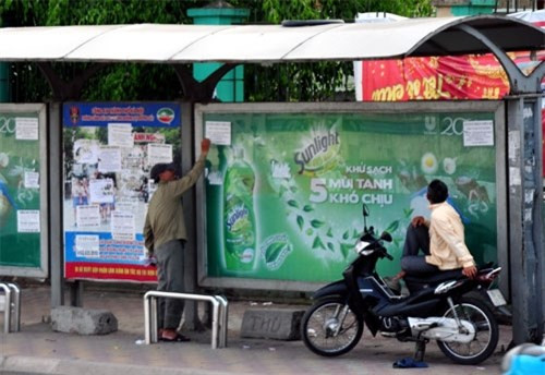 Một người dân "vô tư" dán tờ quảng cáo tại điểm chờ xe buýt (ảnh chụp chiều 12/7 tại đường Phạm Hùng, quận Nam Từ Liêm).