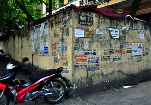 Một bờ tường tại ngõ 111, đường Nguyễn Phong Sắc (quận Cầu Giấy) nhếch nhác với quảng cáo, rao vặt.