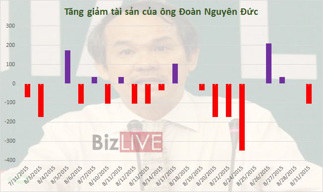 Thiệt hại lớn nhất và cũng khó có thể vui nhất là ông Đoàn Nguyên Đức, Chủ tịch HAGL. Trong tháng 8, ông này đã chứng kiến gần 870 tỷ đồng của mình "bốc hơi"chỉ do ảnh hưởng của thị trường chứng khoán.