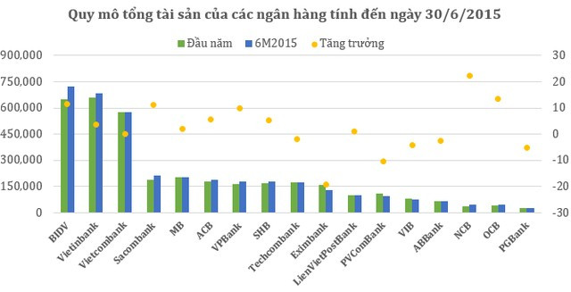 Theo báo cáo của Ngân hàng Nhà nước (NHNN), đến thời điểm 30/6/2015, tổng tài sản của toàn hệ thống tổ chức tín dụng đạt hơn 6,6 triệu tỷ đồng, tăng 1,52% so với đầu năm 2015.