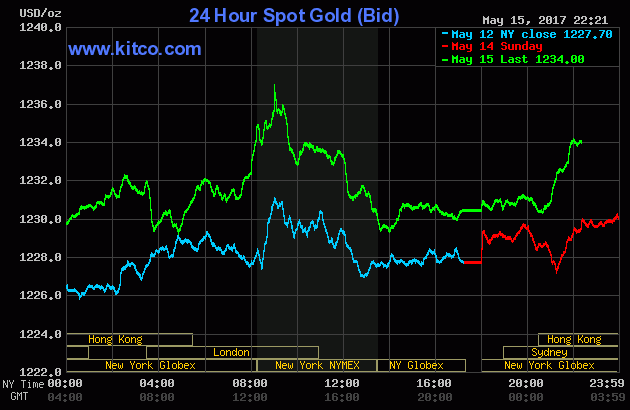 Chốt phiên giao dịch đầu tuần (Thứ Hai ngày 15/5), giá vàng giao tháng Sáu trên sàn Comex tại Sở Giao dịch New York Mercantile tăng tiếp $2,30 (+0,2%) lên chốt tại $1.230,00/oz - cao nhất kể từ ngày 03/05, căn cứ theo dữ liệu của FactSet. Tượng tự, giá bạc giao tháng Bảy cũng tăng 20,1 cents (+1,2%) lên $16,603/oz.