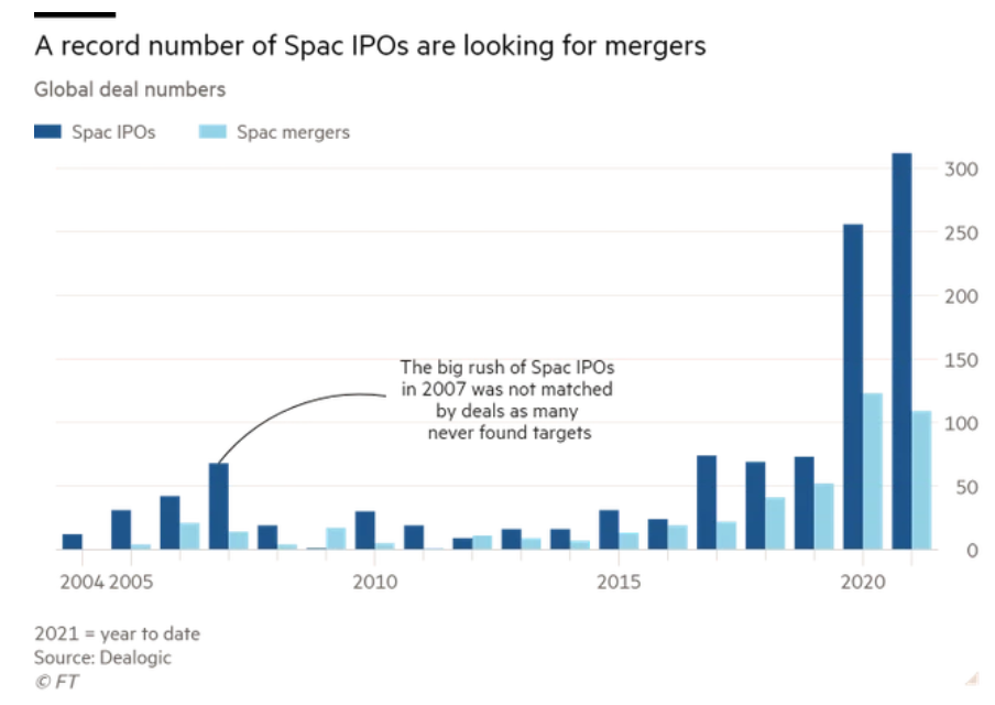 Thống kê của Financial Times cho thấy kể từ năm ngoái số SPAC tiến hành IPO thành công tăng đột biến, tuy nhiên số thương vụ sáp nhập thành công mới chỉ chiếm lần lượt 1/2 và 1/3. Chỉ khoảng 25% số SPAC niêm yết kể từ năm 2019 cho tới nay có thể hoàn thành việc sáp nhập mục tiêu.