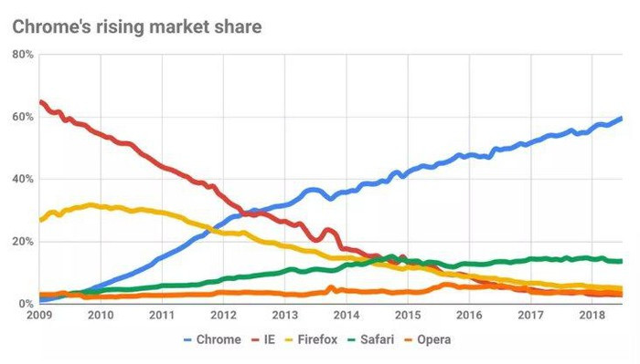 Quá trình phát triển trong 9 năm từ 2009 đến 2018 của Google Chrome vượt trội hơn so với các trình duyệt web khác.