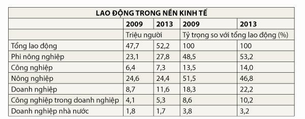 Vai trò quả đấm thép của doanh nghiệp nhà nước (DNNN) thì tệ hơn, dù nắm sở hữu rất lớn về tài sản vẫn không tạo ra nhiều công ăn việc làm. Thí dụ, năm 2013, DNNN chiếm gần 40% giá trị tài sản trong doanh nghiệp nhưng chỉ tạo ra 1,7 triệu việc làm, bằng 14,4% tổng số việc làm trong khu vực doanh nghiệp và bằng 3,2% tổng số lao động trong nền kinh tế. Số lao động trong DNNN thậm chí giảm so với năm 2009. Gần 60% việc làm là từ khu vực tư nhân và 26% là từ khu vực đầu tư nước ngoài (FDI).