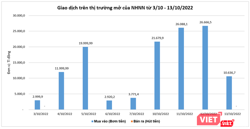 Dữ liệu từ Ngân hàng Nhà nước Việt Nam (NHNN) cho thấy, trong 9 phiên giao dịch từ 3/10 – 13/10/2022, cơ quan này đã liên tục mua vào tín phiếu từ các ngân hàng thương mại, qua đó 'bơm' ra lượng tiền tương ứng để hỗ trợ thanh khoản hệ thống.