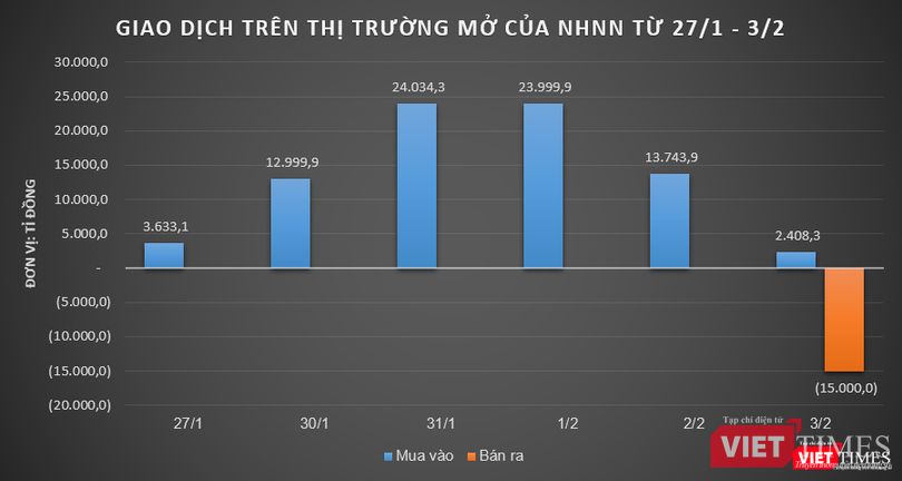 Từ ngày 27/1 – 2/2, NHNN đã thực hiện mua giấy tờ có giá kỳ hạn 7 ngày lãi suất 6%/năm, qua đó bơm ra thị trường tổng cộng 78.411,1 tỉ đồng, đồng thời tạm dừng việc hút tiền vào thông qua bán tín phiếu.