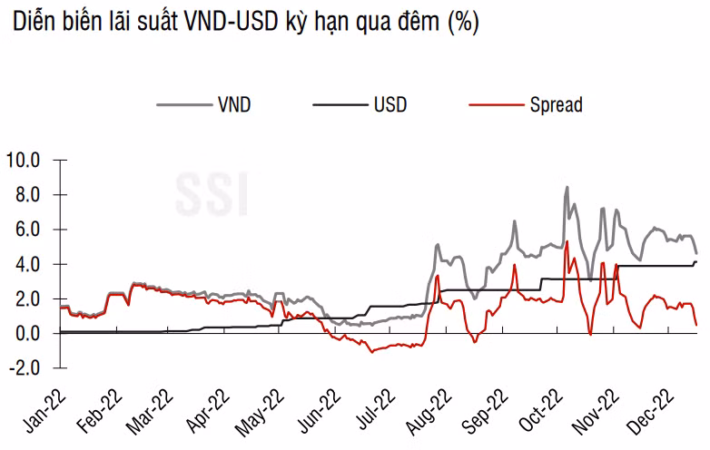 Tuy nhiên, mức chênh lệch giữa lãi suất VND và USD liên ngân hàng kỳ hạn qua đêm đã thu hẹp về chỉ còn 0,5% sau khi Fed tăng lãi suất 0,5% và áp lực lên tỷ giá cũng phần nào xuất hiện.