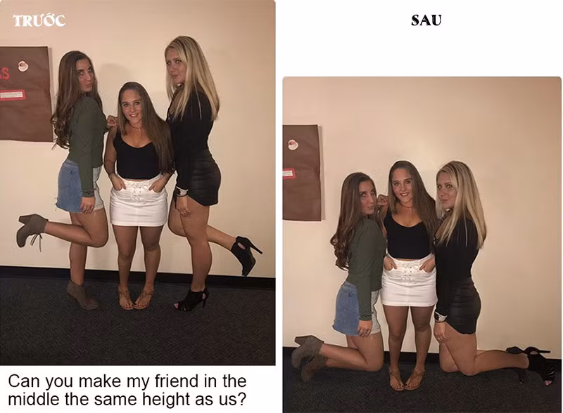 Bạn nào có thể chỉnh sửa để người đứng giữa cũng cao bằng hai chúng tôi?