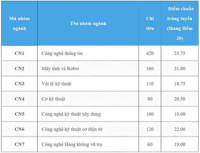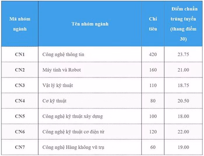 Điểm chuẩn trúng tuyển vào 3 ngành mới Kỹ thuật Robot, Kỹ thuật năng lượng và Công nghệ Hàng không vũ trụ của Đại học Công nghệ - Đại học Quốc gia Hà Nội lần lượt là: 21; 18,75; và 19 điểm.