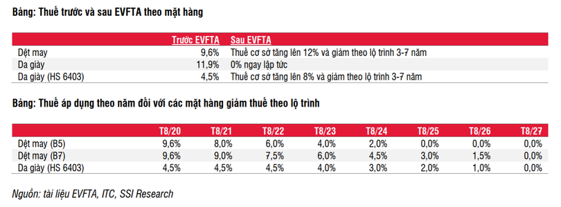 Sau khi EVFTA có hiệu lực, đa số các mặt hàng dệt may sẽ được giảm thuế về 0% theo lộ trình 5 năm (chiếm 77,3% kim ngạch xuất khẩu các mặt hàng chính) hoặc 7 năm (22,7% còn lại). Trong khi đó, đa số các mặt hàng da giày sẽ được giảm thuế ngay lập tức về 0%.