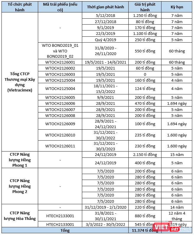 Cụ thể, từ tháng 12/2018 – 3/2022, Vietracimex phát hành tổng cộng 5.579 tỉ đồng trái phiếu, phần lớn được sử dụng để tài trợ cho các dự án năng lượng và bất động sản.