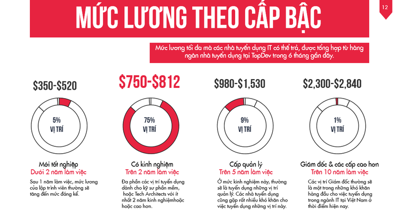 Với sự mất cân bằng giữa nguồn cung và cầu của các lập trình viên (LTV) có chất lượng, “cuộc chiến” thu hút, giữ chân nhân tài CNTT giữa các công ty ngày càng gay gắt hơn. Một số các công ty công nghệ sẵn lòng trả mức lương cao hơn so với thị trường và cam kết tăng tới 20% lương cho các ứng viên có 2 năm kinh nghiệm đi kèm với đó là các phúc lợi ưu đãi khác. Thậm chí với các lập trình viên có nhiều năm kinh nghiệm trong những lĩnh vực “hot” như Cloud Computing, Big Data hay AI có thể dao động từ 1.000 – 1.500 USD (tùy theo năng lực và vị trí đảm nhận).