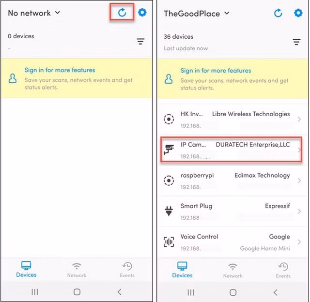 Để thực hiện điều này, bạn có thể nhờ đến ứng dụng có tên gọi Fing. Đây là ứng dụng miễn phí, sẽ giúp liệt kê đầy đủ các thiết bị đang kết nối vào mạng Wi-Fi mà smartphone bạn đang sử dụng, tại đây ứng dụng sẽ liệt kê rõ có camera nào đang kết nối vào mạng Wi-Fi hay không.
