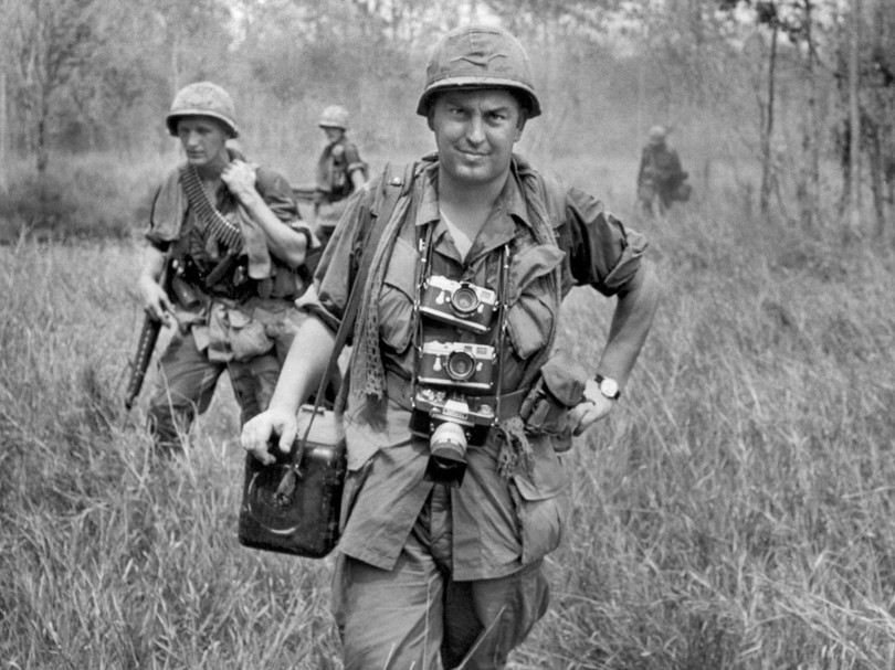 Nhiếp ảnh gia AP Horst Faas, với máy ảnh đeo xung quanh cổ, đi cùng với lính Mỹ trong khu vực chiến thuật C