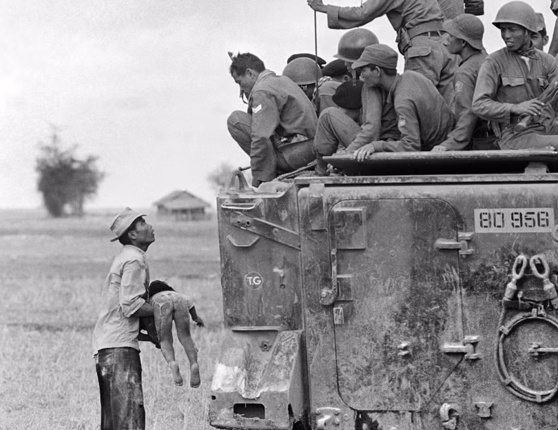 Một người cha gần như phát điên khi đưa xác đứa con mình cho binh sĩ Sài Gòn nhìn thấy từ trên xe bọc thép ngày 19.03.1964. Đứa trẻ vô tội đã thiệt mạng khi quân đội Sài Gòn truy quét du kích trong một ngôi làng gần biên giới Campuchia. Nhờ bức ảnh này, nhiếp ảnh gia AP Horst Faas đã nhận được giải thưởng Pulitzer năm 1965.