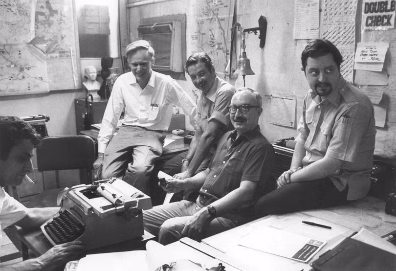 Năm trưởng văn phòng đại diện AP tại thời điểm này và sau đó ở Sài Gòn ngày 28.04.1972. Từ trái: người dùng máy chữ là George Esper, Malcolm Browne, George McArthur, Edwin Q White và Richard Pyle