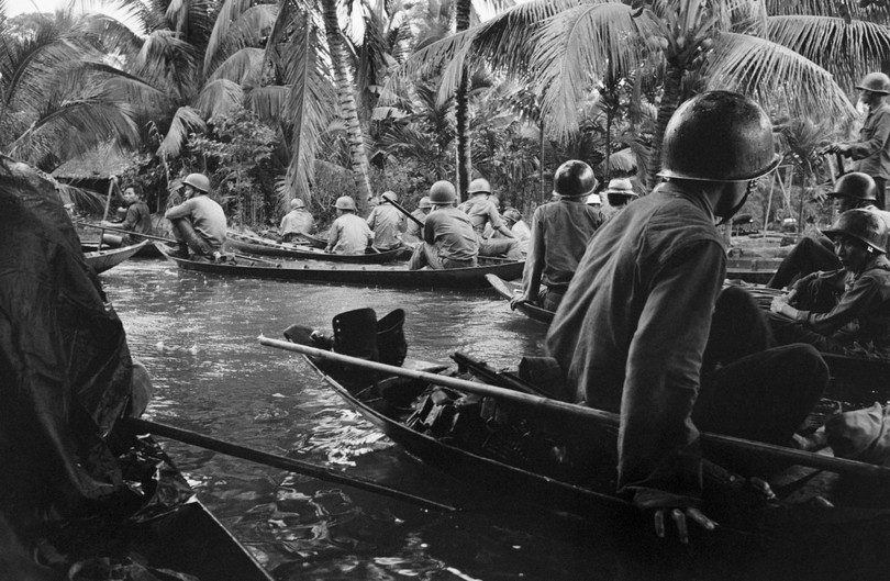 Ảnh được chụp khi mưa và gió mùa đột ngột ập đến, một bộ phận của một đơn vị khoảng 130 binh sĩ Sài Gòn di chuyển về hạ lưu trên ghe tam bản tham gia cuộc tấn công rạng sáng vào căn cứ của Quân Giải phóng vào ngày 10.01.1966. Một số du kích theo báo cáo đã bị thương vong trong chiến dịch, xảy ra ở khoảng 13 dặm về phía đông bắc Cần Thơ, vùng đồng bằng sông Cửu Long trong mùa lũ lụt