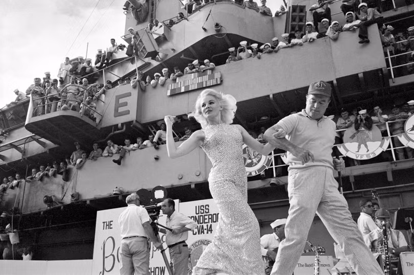 Diễn viên điện ảnh Carroll Baker bật ngón tay với các thủy thủ cổ vũ từ trên tàu khi Bob Hope dẫn cô đi qua boong tàu của tàu sân bay USS Ticonderoga tháng Mười Hai năm 1965. Hơn 2.500 thủy thủ đã được thưởng thức chương trình của đoàn Hope trên tàu sân bay. Diễn viên hài đã đưa vào chương trình trong các kỳ nghỉ hàng năm viếng thăm các lực lượng quân đội đến miền Nam Việt Nam từ năm 1964-1972