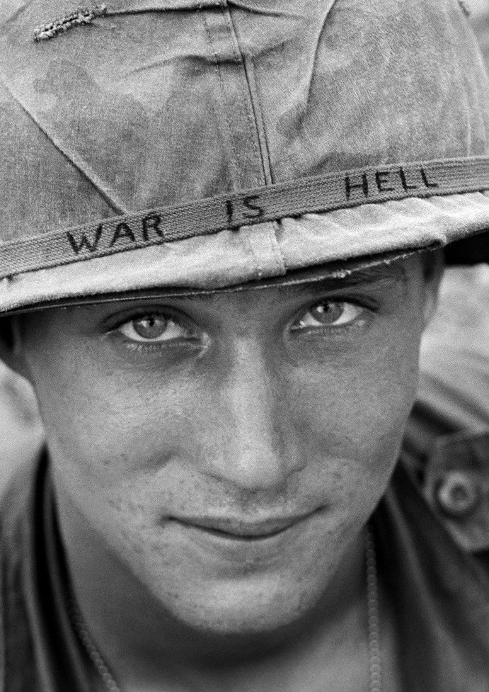Một lính Mỹ giấu tên mang khẩu hiệu "Chiến tranh là địa ngục" viết tay trên mũ sắt tháng 6.1965. Người lính này phục vụ trong Lữ đoàn dù 173 với nhiệm vụ phòng thủ sân bay Phước Vinh