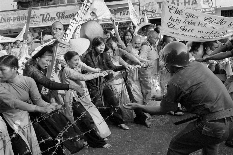 Các nhà sư và phụ nữ đang kéo chướng ngại vật bằng dây kẽm gai, được thiết lập trước chùa Giác Minh, Sài Gòn nhằm ngăn chặn cuộc biểu tình ngày 17.07.1963. Cảnh sát cầm dùi cui đánh bị thương ít nhất 50 người trong các cuộc biểu tình, nổ ra rất nhiều vào thời gian này do phong trào Phật tử đấu tranh chống lại chế độ Ngô Đình Diệm. Những tháng sau đó, cảnh sát bí mật đột kích các ngôi chùa trên khắp đất nước, chiến dịch này đã kích động một làn sóng giận dữ chống lại chính phủ.