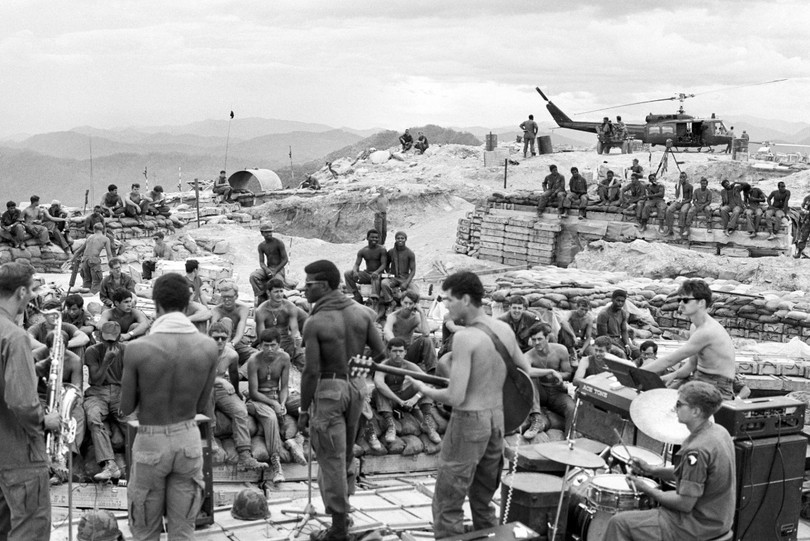 Những binh sĩ Lữ đoàn 3, Sư đoàn 101 trình diễn một buổi nhạc rock với phông nền bao quanh là những biểu tượng của chiến tranh: lô cốt bằng những thân cây, máy bay trực thăng và các bao cát, tháng 7.1970. Họ đang đào đắp căn cứ hỏa lực Kathryn trên ngọn đồi phía nam DMZ (khu phi quân sự)