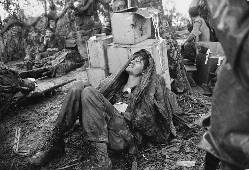 Một lính dù Mỹ, bị thương trong trận chiến trên đồi Hamburger Hill, đang đau đớn khi chờ cấp cứu y tế tại một căn cứ gần biên giới Lào ngày 19.05.1969