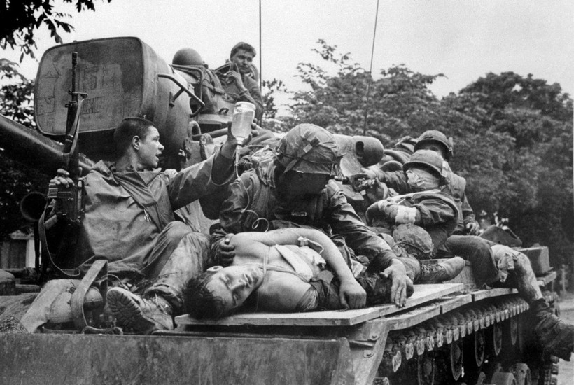 Thủy quân lục chiến Mỹ cấp cứu thương binh nặng trên một chiếc xe tăng, chiếc xe vượt qua các đường phố Huế về phía máy bay trực thăng cứu thương ngày 17.02.1968. Chỉ có xe tăng mới có thể đi trên đường đầy đổ nát từ các tòa nhà bị phá hủy trong cuộc tấn công Tết Mậu Thân và cuộc chiến vẫn đang tiếp diễn. Thủy quân lục chiến đã bị bắn nhiều lần trên đường đi.