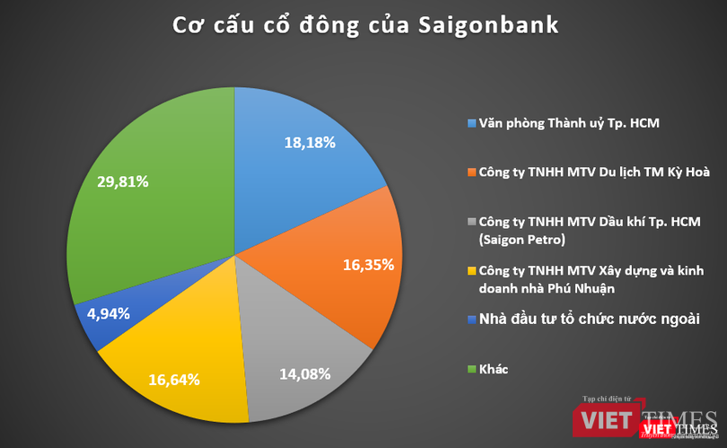 Danh sách cổ đông cũng cho thấy Saigonbank có 4 cổ đông lớn là Văn phòng Thành ủy Tp. HCM (56 triệu cổ phần, chiếm 18,18% VĐL), Công ty TNHH MTV Du lịch TM Kỳ Hòa (50,3 triệu cổ phần, chiếm 16,35% VĐL), Công ty TNHH MTV Dầu khí Tp. HCM (Saigon Petro, 43,3 triệu cổ phần, chiếm 14,08% VĐL) và Công ty TNHH MTV xây dựng và kinh doanh nhà Phú Nhuận (51,25 triệu cổ phần, chiếm 16,64% VĐL).