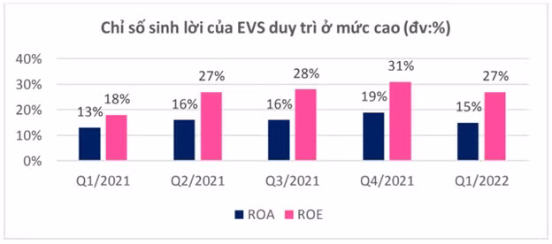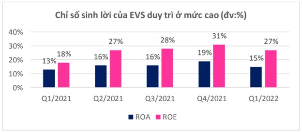 Trừ đi chi phí hoạt động, EVS báo lãi sau thuế 422,1 tỷ đồng năm 2021, tương ứng với tỷ suất sinh lời trên vốn chủ sở hữu (ROE) ở mức 25% - thuộc tốp những công ty chứng khoán có hiệu quả sử dụng vốn cao nhất.