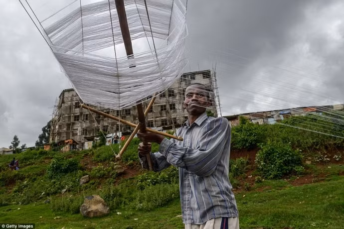 Một người đàn ông đang cuộn sợi bong gần chợ Shiro Meda, Addis Ababa ngày 10 tháng 7 năm 2014