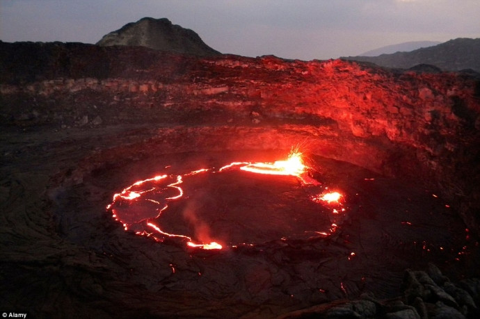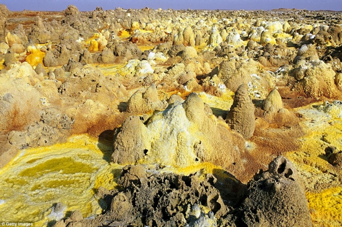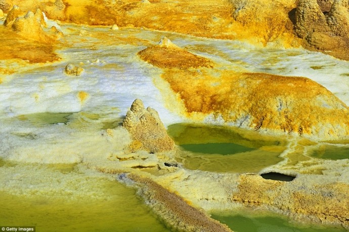 Miệng núi lửa Dallol hình thành từ trận phun trào năm 1926 với các suối nước mặn nóng
