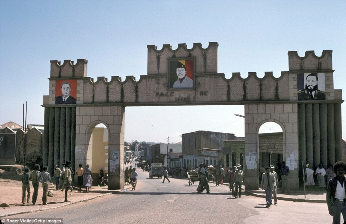 Cổng vào thành phố Harar hiện đại với chân dung của Fidel Castro, Brejnev và tướng Mengistu