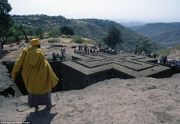 Du khách thăm quan Bete Giyorgis (còn gọi là nhà thờ thánh George) tại thánh địa Lalibela, một địa điểm du lịch nổi tiếng tại Ethiopia
