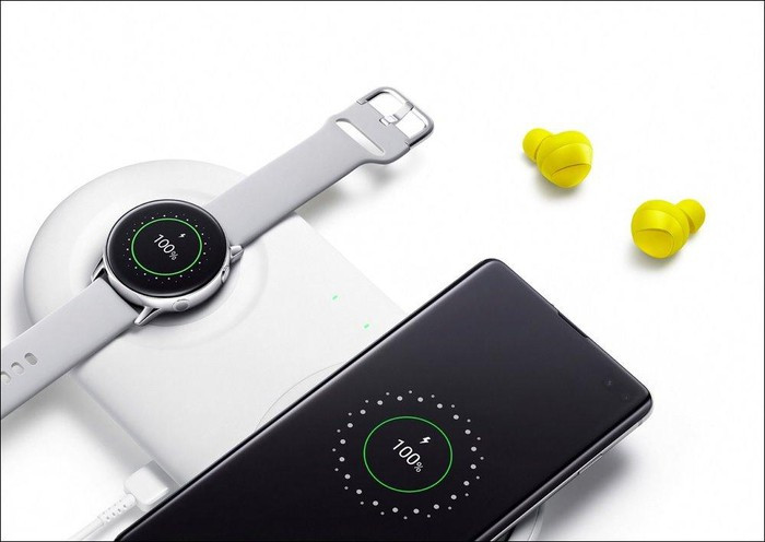 Chẳng hạn, bạn có thể cắm điện vừa sạc Samsung Galaxy S10, vừa đặt tai nghe Galaxy Buds hoặc đồng hồ thông minh Galaxy Watch Active vào mặt lưng. Khi đó là bạn đã đồng thời đang làm đầy pin cho hai thiết bị.