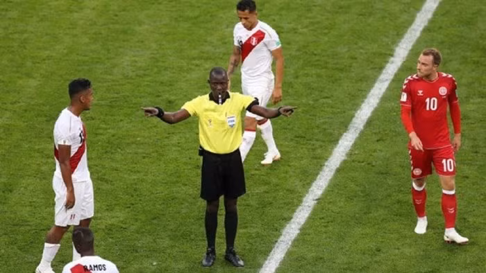 Trọng tài Bakary Gassama tại trận đấu giữa Peru và Đan Mạch.